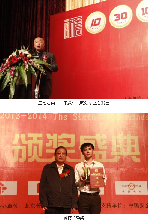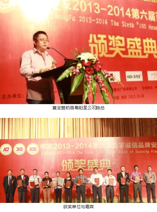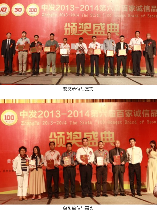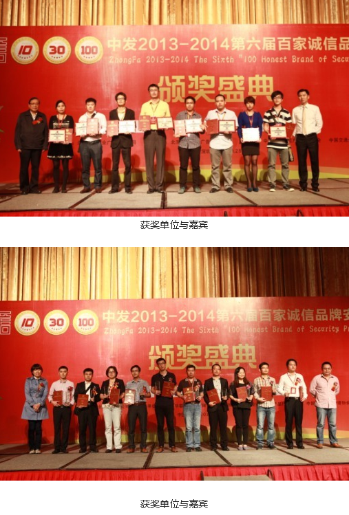 活動上,頒發(fā)的獎項有“2013-2014年度中國安防十大用戶滿意品牌”、“ 2013-2014年度中國安防十大核心技術(shù)品牌”、“ 2013-2014年度中國安防十大最具價值品牌”、“ 2013-2014年度中國安防十大誠信工程商”、“ 2013-2014年度中國安防誠信企業(yè)家”、“2013-2014年度中國安防行業(yè)誠信金樽獎”、“ 2013-2014年度30家金牌誠信安防供應(yīng)商”、“ 2013-2014年度百家誠信品牌安防供應(yīng)商”。