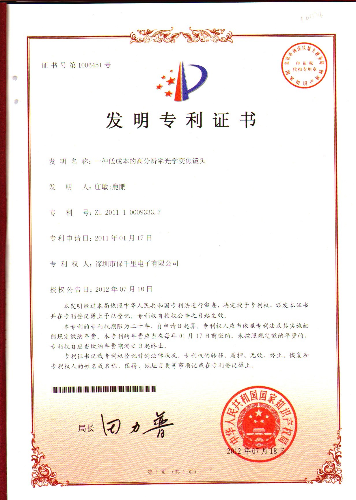 本次由中國安防百強(qiáng)企業(yè)“保千里”榮獲的國家發(fā)明專利:一種低成本的高分辨率光學(xué)變焦鏡頭,發(fā)明專利號:ZL 2011 10009333.7,一舉解決了這一技術(shù)難題。“保千里”提供一種低成本的高分辨率光學(xué)變焦鏡頭,可滿足現(xiàn)有高清分辨率要求的同時(shí)實(shí)現(xiàn)體積小巧及低成本,為廣大OEM/ODM廠商供應(yīng)低成本高清鏡頭的同時(shí),也有力地推進(jìn)了產(chǎn)業(yè)的發(fā)展。