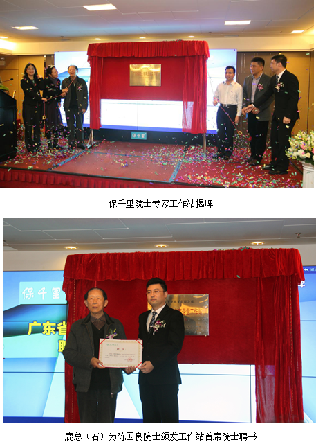在精彩的深圳大學(xué)裴繼紅教授產(chǎn)學(xué)研項目介紹及深圳大學(xué)特聘教授徐瑋博士ATR應(yīng)用項目介紹過后,迎來本次活動的高潮——保千里院士專家工作站揭牌儀式,陳國良院士、馮日光副主席、張莉副主席、鹿鵬副總裁等領(lǐng)導(dǎo)共同為保千里院士專家工作站揭牌,保千里副總裁鹿鵬為陳國良院士頒發(fā)工作站首席院士聘書。