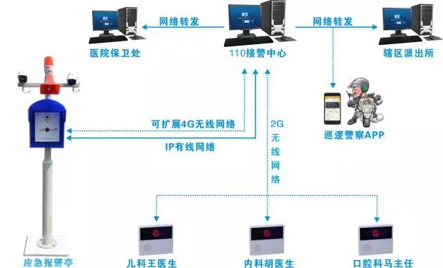 在醫(yī)院門衛(wèi)室、重點要害部位安裝一鍵式應急報警亭,與110接警中心聯(lián)網,確保發(fā)生突發(fā)案事件時能及時報警到110接警中心,同時,110接警中心通過網絡實時轉發(fā)給醫(yī)院警務室、轄區(qū)派出所、巡邏民警手機APP,以便迅速處置,遏制擾亂醫(yī)院診療秩序、傷害醫(yī)務人員的各類案事件,維護醫(yī)院秩序總體的持續(xù)穩(wěn)定。
