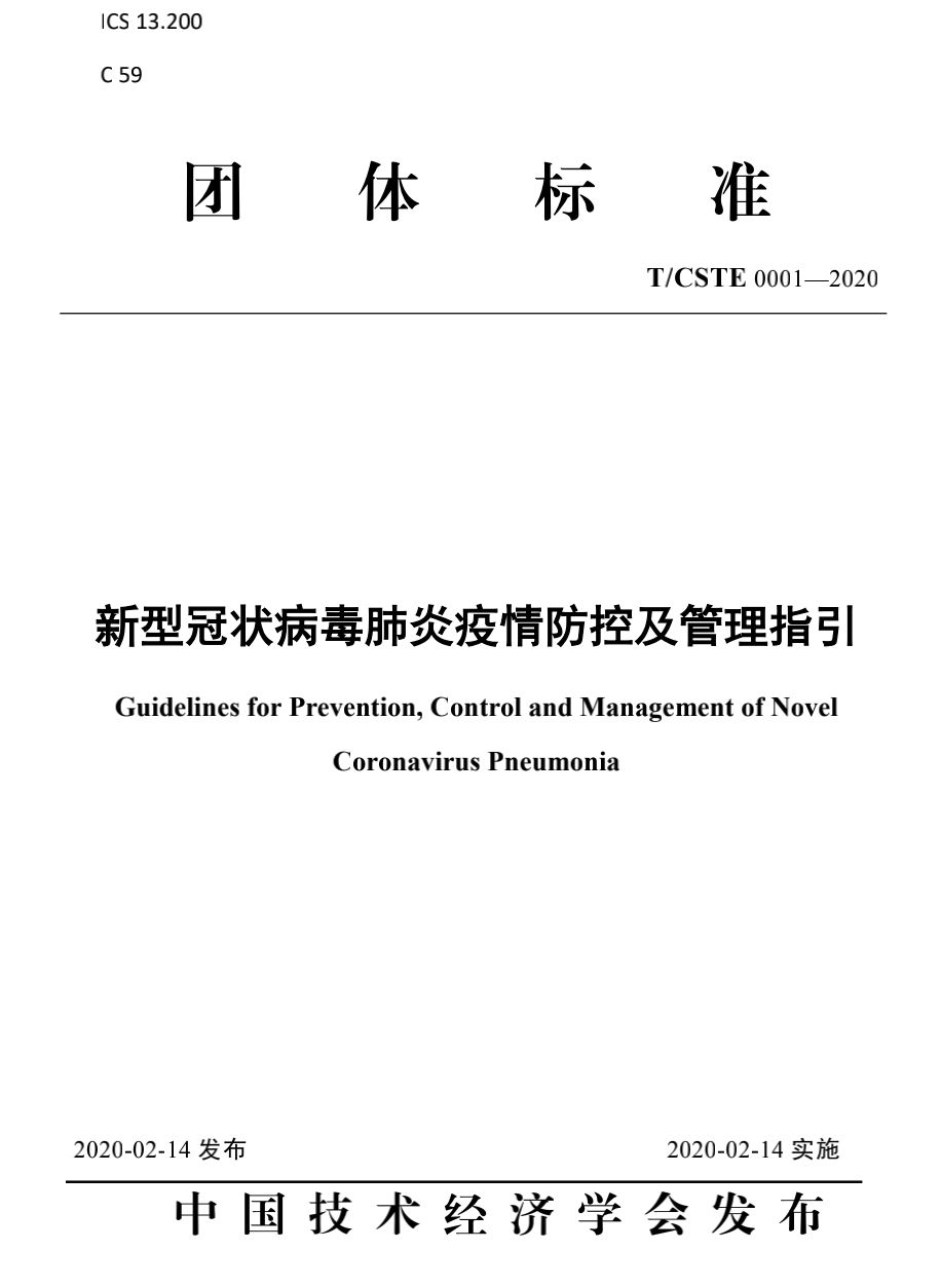 針對(duì)新型冠狀病毒感染的肺炎疫情,為有效指引機(jī)關(guān)、學(xué)校、企事業(yè)單位、社區(qū)、人員聚集等場(chǎng)所相關(guān)人員開(kāi)展通風(fēng)空調(diào)、所屬人員、給水排水、垃圾收集、暫存及收運(yùn)和管理等防控工作,近日,由中國(guó)技術(shù)經(jīng)濟(jì)學(xué)會(huì)組織制定的《新型冠狀病毒肺炎防控及管理指引》團(tuán)體標(biāo)準(zhǔn)正式發(fā)布。