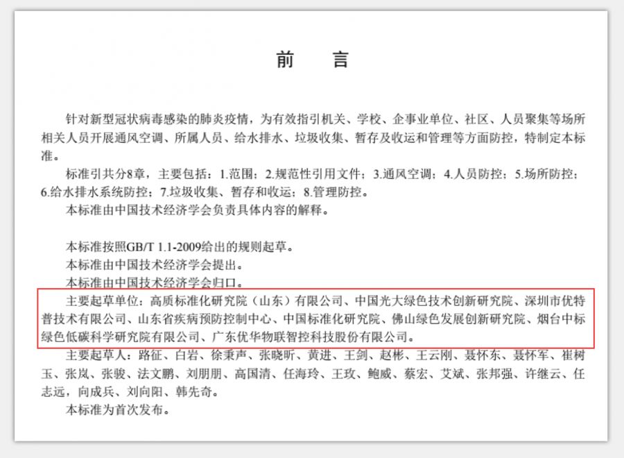 標(biāo)準(zhǔn)主要起草單位如下:高質(zhì)標(biāo)準(zhǔn)化研究院(山東)有限公司、中國(guó)光大綠色技術(shù)創(chuàng)新研究院、深圳市優(yōu)特普技術(shù)有限公司、山東省疾病預(yù)防控制中心、中國(guó)標(biāo)準(zhǔn)化研究院、佛山綠色發(fā)展創(chuàng)新研究院、煙臺(tái)中標(biāo)綠色低碳科學(xué)研究院有限公司、廣東優(yōu)華物聯(lián)智控科技股份有限公司。