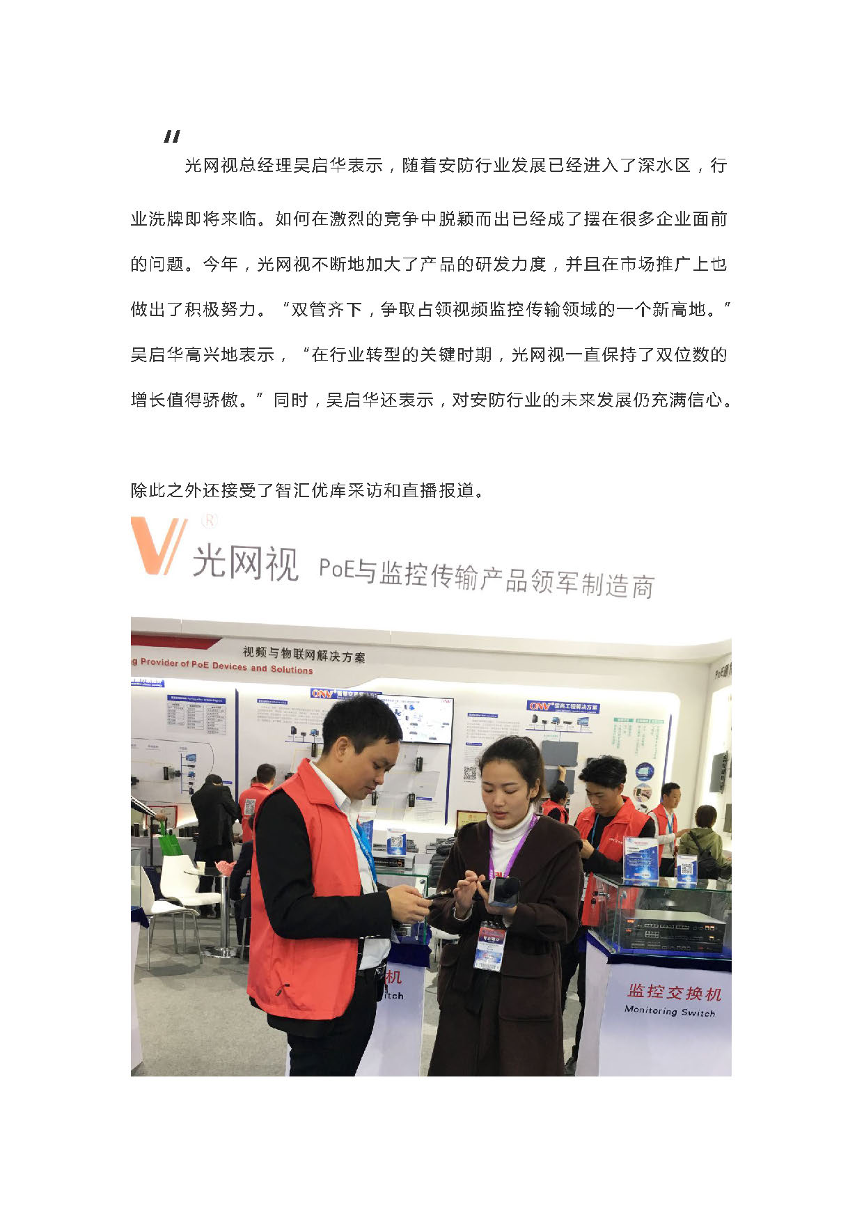 廣大朋友的觀摩和喜愛,更通過在現(xiàn)場(chǎng)工作人員的講解、演示,把其結(jié)構(gòu)配置簡(jiǎn)單、功能強(qiáng)大、高清靈活等優(yōu)勢(shì)發(fā)揮的淋漓盡致。順應(yīng)行業(yè)發(fā)展趨勢(shì),打破思維禁錮,改革技術(shù)創(chuàng)新應(yīng)用,不斷深耕細(xì)作行業(yè)市場(chǎng),積極走在產(chǎn)品潮流最前端。