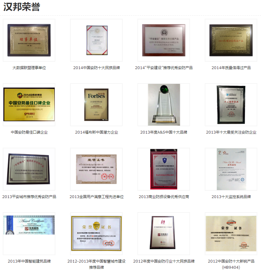 公司是國家高新技術企業(yè)、北京市高新技術企業(yè)協(xié)會副會長單位、中國安防協(xié)會副理事長單位,通過了ISO-9001質量體系和ISO-14000環(huán)境體系認證,產品先后通過了FCC/CE、ROSH、CCC等認證。穩(wěn)步高速發(fā)展的漢邦高科也獲得行業(yè)內外的普遍認可,連續(xù)多年入圍“中國安防十大品牌”、“平安城市”推薦品牌等,多次入圍福布斯中國潛力企業(yè)榜,入圍中關村國家自主創(chuàng)新示范區(qū)“創(chuàng)新型試點企業(yè)”,嵌入式數(shù)字硬盤錄像機榮獲“國家重點新產品”稱號。